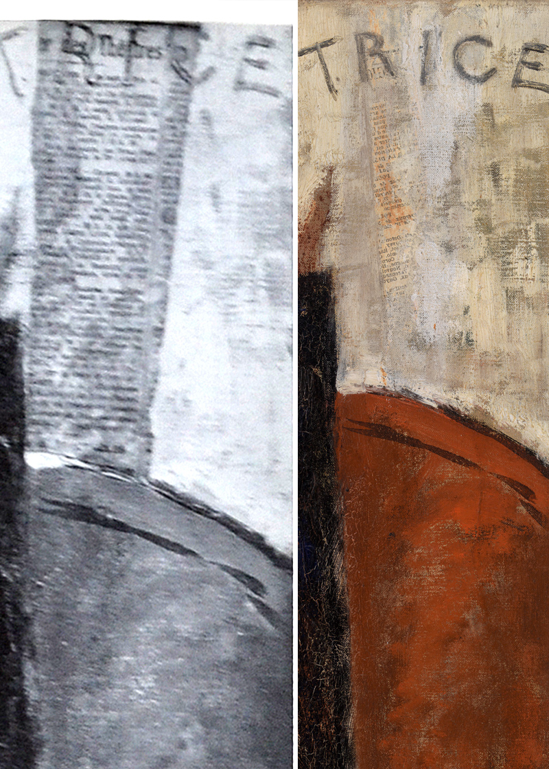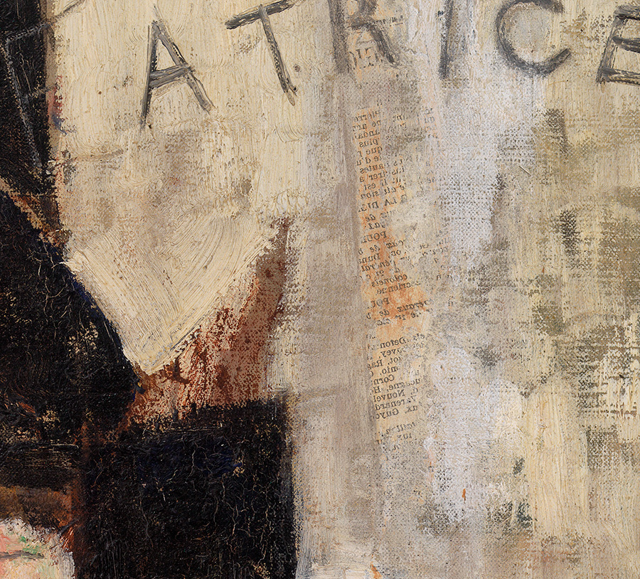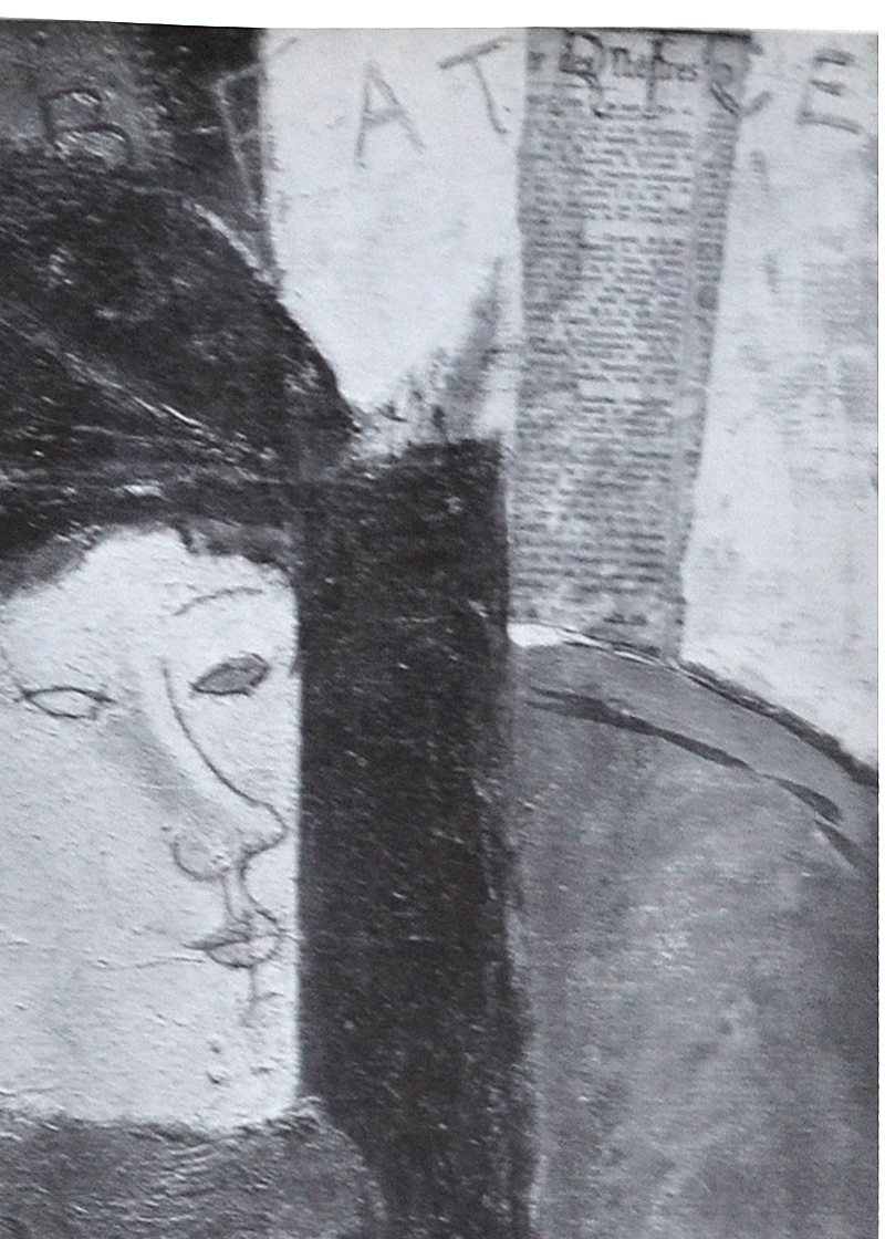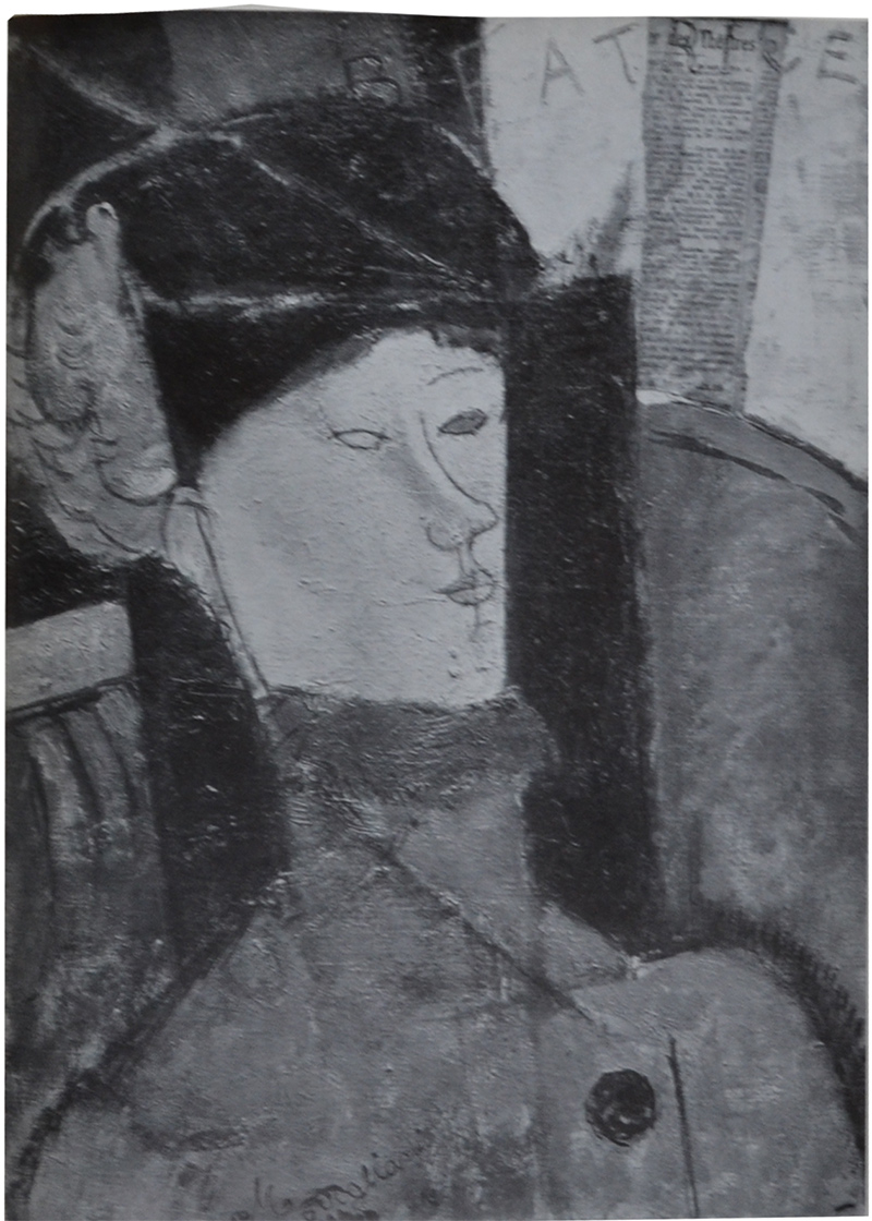 | Other | Nº 226 in D'Atri papers as Beatrice Hastings a la Toque - 55 x 33 - dated 1916 - provenance in Paul Guillaume 1929 ------------------------------------------------------------------------------------------------------------------------------------------------------------------------------------------- Signature of the painting: ![]() ------------------------------------------------------------------------------------------------------------------------------------------------------------------ Detail of the ear where the drawing is visible and is painted over the color (on top of the color) ![]() ------------------------------------------------------------------------------------------------------------------------------------------------------------------------------------------- This painting is usually named as oil on canvas and newspaper collage: But the newspaper is turned , to read it you should have to use a mirror, this image is already turned (see the R): --------------------------------------------------------------------------------------------------------------------------------------------------------------------------------------------------------- And now after reading all this, can anybody explain me this image ?? it comes from Gothard Jedlicka, Modigliani, E. Rentsch, Zürich, 1953, page 29 and this is the exact image of the book, with no changes of any kind: ![]() a close up of the newspaper area in the painting: ![]() 1.- The newspaper title say ...ER DES THEATRES 2.- Is much bigger, from the end of the T to the middle of the C, so is the whole column Is it a critic's review of a play??? So the newspaper was changed and painted in white over and then the letters repainted again???? decide for yourself: I bet the newspaper had some sense, something interesting over Hastings work, so the sense is now lost (is clearly not the same column & title) like the RIC letters, lost by a totally neglect restoration??? The "new" newspaper say "GIC" instead of "er des Théatres", nobody noticed? ??????? This is coincident with the old title of the painting: "Au theatre" Beatrice. She is seated in the theatre watching a play. |