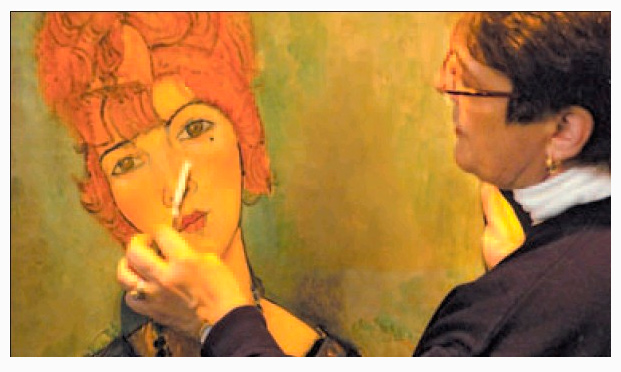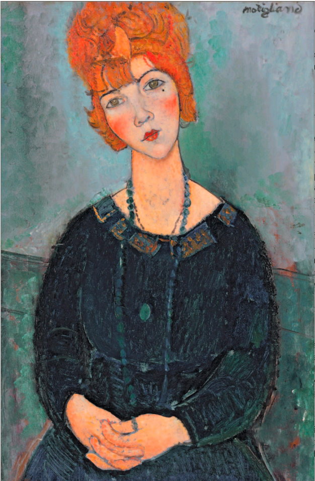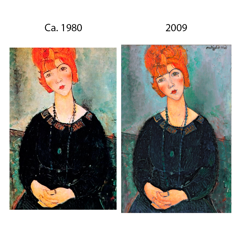 | Other | Not in D´Atri papers. -------------------------------------------------------------------------------------------------------------------------------------------------------------------------------------------- The signature of the painting: ![]() -------------------------------------------------------------------------------------------------------------------------------------------------------------------------------------------- The painting was cleaned in 2007 by the Chicago art Institute restorer Faye Wrubel and the surprise of the bright colors distorted totally the previous idea of the painting a dark yellow varnish layer was retired discovering Bright colors that are usual in this period, she did a magnificent work: Restoration/cleaning respected all the light and colors: ![]() This cleaning discovered the real color of the necklace, the removed chair by the painter and changed completely the position of the portrayed, the green blue shadow on the back made the sitter increase by the trick of the position against the background. It was a totally successful work. ![]() This is the typical example that will make a connoisseur expert to say that the restored/clean painting was a fake because Modigliani never did green blue shadow and such a bright background and this work even if magnificent is rare for the 1916/17 production. -------------------------------------------------------------------------------------------------------------------------------------------------------------------------------------------- Framed in Chicago Art Institute at exhibition (unknown date): |