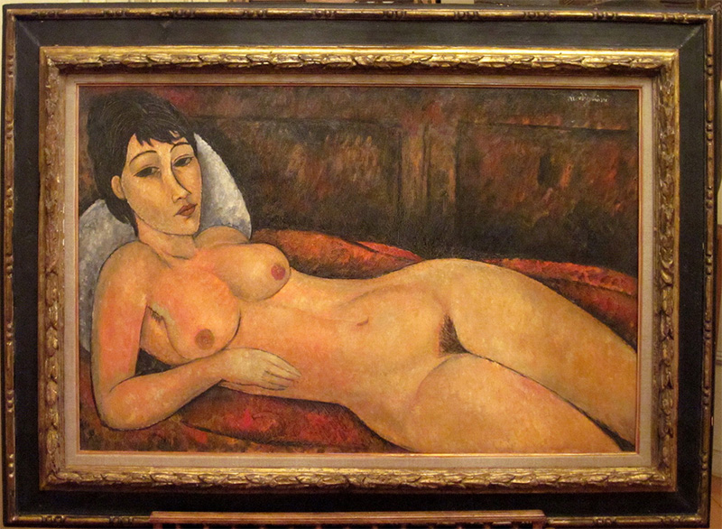 | Other | Certificates of authenticity : Angela Ceroni, March 25, 1997 and July 16, 2004 (Authentic part of Ceroni Archiv) J. Lanthemann, November 21, 1994 Jeanne Modigliani, February 3, 1984 Christian Parisot, March 7, 1995 Christian Parisot, 2012 --------------------------------------------------------------- From Angela Ceroni: - Angela Ceroni (Milano), Heiress of Ceroni archives, dated 25.3.1997: in this certificate Mme. Ceroni say: the painting is registered in my archive, without an archive number since tha painting has not been shown in any Ceroni publication. ( so this is not a certificate, just that it is recorded in the files, not saying wich category) But in a declaration made in Geneva the 25th of March 1997, Angela Ceroni say: A mon avis, c'est une oeuvre authentique du peintre Amadeo Modigliani To my Knowledge this is an authetique work by painter Amadeo Modigliani. ------------------------------------------------------------------------------------------------------------------------------------------------------------------------------------------------------- Scientific expertise done by L. Sheldon in December 1998 UCL painting analysis LTD 43 Gordon square, London Report C1323 - Painting made in an unlined canvas primed probably by the author. - Preparation of the canvas made with Titanium white ( the report mentions that the first time Titanium white was available commercially is in 1918) - Probably presence of egg emulsion. - Pigments found in the work were those available between 1918 and the present day. - The signature is made at the time of the underlying paint. - The X ray showed some alterations (pentiments) - Compared to the Nude on Courtlaud some differences sould be seen, but the overall style of the brushwork was not dissimilar. The underlying brushwork was similar to that of the surface brushwork as in the Courtlaud painting. (this exact line means that the x-ray is different in both works, the visible layer is similar in brushwork, not the inside just the visible) Conclussions: No materials or techniques employed in this painting could be dated firmly. However, the Titanium white in the ground means that it had to be executed after 1918. Since Modigliani died in 1920, the painting could have been done in these last two years. There is no published analysis of paintings by Modigliani for comparison. ------------------------------------------------------------------------------------------------------------------------------------------------------------------------------------------------------- At that time there were just a few analysis but the 1981 publication by the Reunion des musees would solve any issue, Actually there is new and trustable publications to compare. ------------------------------------------------------------------------------------------------------------------------------------------------------------------------------------------------------- The same model as in Nº 129 - 128: - - ----------------------------------------------------------------------------------------------------------------------------------------------------------------------- The painting framed: Signature Close up: There is nothing relevant in tha back of the canvas, probably relined: |