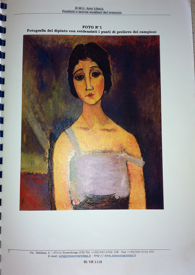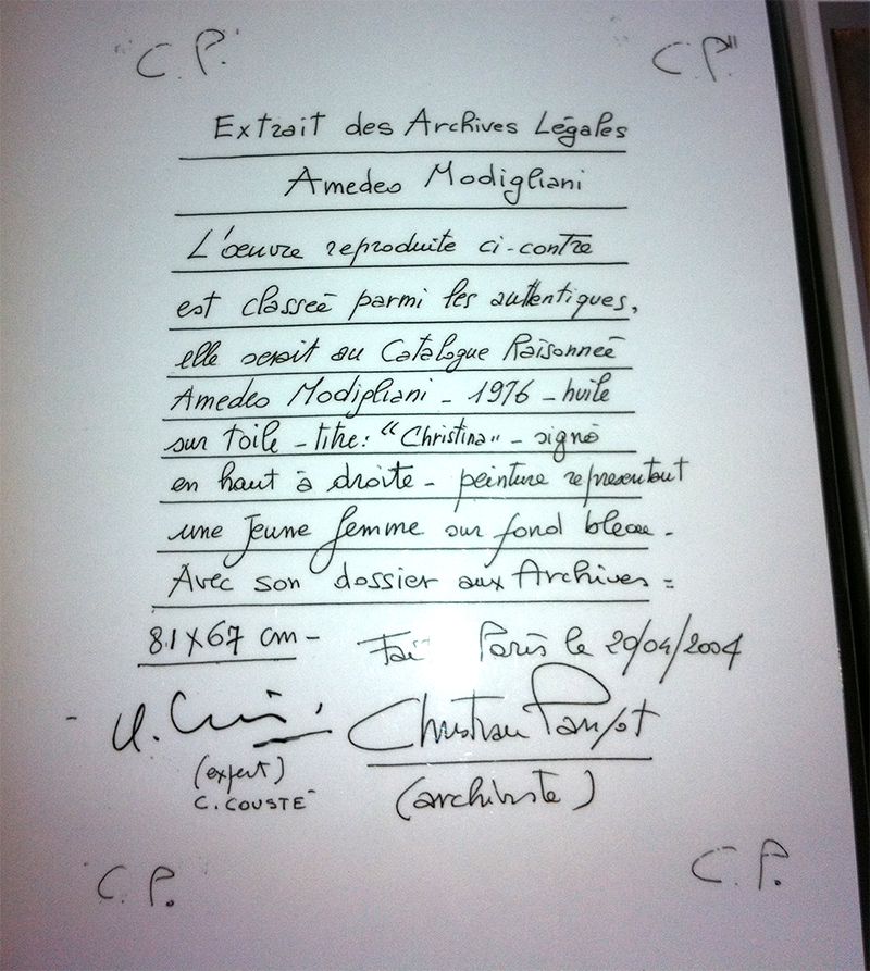 | Other | Not In D' Atri papers ------------------------------------------------------------------------------------------------------------------------------------------------------------------- I received it by e-mail asking for my opinion, the work was with a certificate by Christian Parisot that has exactly the same date as the certificate of the other Christina : - This work will be sold with a photographic certificate from the Archives Legales Amedeo Modigliani, dated 20 April, 2004, Paris. ![]() This is the Christina auctioned in Bonhams in June 2004 bearing the certificate dated 20/04/2004 ![]() The "certificate sent to me by e-mail for this other version of Christina": The date and derscription is similar with the other Christina, the size dont match and the background is not blue... The work came with a dossier from Restauro Arte BML from Verona with a web : www.restauroartebml.it I never received more emails from the same person. |