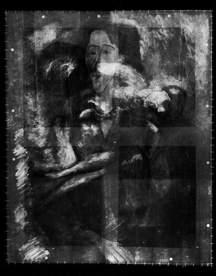 | Other | Note: This painting was done at the same time with Kisling (based on Pearlman information), the Kisling version of this image known as Jean Cocteau assis dans son atelier (1916) show the way Modigliani works, while Kisling is worried about the space and the volumes and things that surround Cocteau, Modigliani converts all the environment of Cocteau in a few straight lines used only to send the portrayed forward to the viewer, only the character is important, as extreme example of this, take a look at the curved shape behind the chair back near the neck and with that curve in mind go down the page to see the x-ray, the curve is just the head of the previous painting. The painting by Kisling is dated in 1916 and that date has changed the datation for the Modigliani one, but probably the painting remained unsigned and unfinished until 1917 that could probably be the correct explanation on why the Modigliani work is dated in top in 1917. ------------------------------------------------------------------------------------------------------------------------------------------------------------------------------------------ Nº 325 in D'Atri papers, as portrait du poête Jean Cocteau - 100 x 81 signed top left, dated 1917 Paris, provenance: Zborowski > Decaves > Guillaume in 1926 ------------------------------------------------------------------------------------------------------------------------------------------------------------------------------------------- Detail of signature in visible normal light: ![]() Inverted image: The line where the date 1917 is painted, usually lies under the frame that is why none of the modern historians mention it, Since Schlamenbach all the historians had accepted as valid the 1916 date, mainly based on the Kisling version that is dated in 1916. So just taking the painting out of the frame and they would have seen the truth and instead of doing it, they remained attached to the bibliographic sources/mistakes instead of seeing by their own. In red the area that is usually hidden under the frame: ![]() ------------------------------------------------------------------------------------------------------------------------------------------------------------------------------------------- The eyes / eyebrows of this painting are absolutely unique but matches perfectly the style used by Modigliani from 1916 to 1917 production, the use of patches of color to contour is classical in this period. ![]() ------------------------------------------------------------------------------------------------------------------------------------------------------------------------------------------ Detail of the ear where the drawing with colors and black detail is visible and is painted over the color (on top of the color) very strongly applied. ![]() -------------------------------- Detail of hand: ![]() ------------------------------------------------------------------------------------------------------------------------------------------------------------------------------------------- The X-ray of this painting show another painting under the actual layer, probably by Moïse Kisling, this re use of the canvas from another fellow artist show that Modigliani's lack of materials was real. Image of the X ray: If we turn this image 90 degrees and enhance the back painting this is the result: ![]() ------------------------------------------------------------------------------------------------------------------------------------------------------------------------------------------- The painting framed at the Princeton University Museum, the frame is the same since at least 1950 Image of the Painting at the Pearlman Office Ca. 1960: ![]() Back of the canvas showing that it has been relined and set up a new stretcher: ------------------------------------------------------------------------------------------------------------------------------------------------------------------------------------------- The number of drawings and sketches for this painting I have found in old sales and books is more than 15 serious ones |