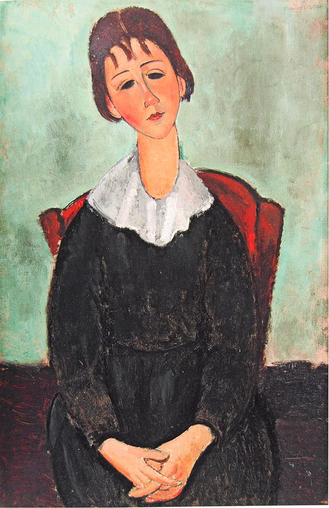 | Bibliography | -?- ? The Studio, April 8- 1929 Dale, Modigliani, Knopf, New York, 1929, pl. 25 Pfannstiel, "catalogue presume" Modigliani. L'Art et la Vie. Preface de Louis Latourrettes, Seheur, Paris, 1929, pp. 44, 119 Franchi, Modigliani, Arnaud, Firenze, 1946, pl. 43 Apollonio, 1950 Pfannstiel, Modigliani et son oeuvre, etude critique et catalogue raisonne, bibliotheque des arts, Paris, 1956 - nº 274 Lanthemann, Modigliani, catalogue raisonné: sa vie, son oeuvre, son art, G. Condal, Barcelona, 1970 - nº 293 Patani, Catalogo Generale, Leonardo, Milano, 1991-94 - nº 225 - dated 1917-18 - titled Seated girl (Huguette) Decrooq-Restellini, L'Ange au visage grave, Musée du Luxembourg, Paris, 2002, pp. 330-331 - nº 74 (dated 1918) ? In process |