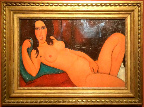 | Other | Pfannstiel Photo: ![]() Painting in Japan: Differences between both images: Taking note that the Pfannstiel Photo is a copy in black and white that lost a big percent in quality, probably cut for printing purposes, the main areas of interest would be the blue cushion, the eyes and in general the black lines that seems to move from one to another, here is a more in detail example: Detail of the Cushion in Japan Detail of the Cushion in Pfannstiel ![]() What is different: all the lines are moved, not the details, the lines. Detail of the eyes of the model in Japan: Detail of the eyes in Pfannstiel: What is different: all the lines are moved, not the details, the lines. Detail of the lips of the model in Japan: Detail of the lips in Pfannstiel: What is different: all the lines are moved, not the details, the lines. Detail of the signature in Japan: Detail of the signature in Pfannstiel: What is different: all the lines are moved, not the details, the lines, the L is visible, the i and the a, is visible... Therefore are clear things different between the image present in Pfannstiel, Modigliani et son oeuvre, elude critique et catalogue raisonné, 1956 - nº 188, plate 21 and the painting in Japan. Could it be because of cleaning, restoration or a moved image in Pfannstiel, who knows only a real X ray and pigment analysis would tell it for certain. But personally I do not trust none of the 2 explanations (Patani as a forgery or Restellini as original) ------------------------------------------------------------------------------------------------------------------------------------------------------------------------------------------- Nº 244 in D' Atri papers dated 1917, size 62 x 100, titled "Nu couche" - Provenance in Zborowski, 1929> ? ------------------------------------------------------------------------------------------------------------------------------------------------------------------------------------------- Detail of signature in visible normal light: ![]() ------------------------------------------------------------------------------------------------------------------------------------------------------------------- The painting framed in Budapest, Modigliani, Hungarian National Gallery, 2016: ![]() ------------------------------------------------------------------------------------------------------------------------------------------------------------------------------------------- The eyes of this painting reflect a style Modigliani used from the end of 1915 to the first months of 1918, very similar eye construction can be seen in many Modigliani works from this period: ------------------------------------------------------------------------------------------------------------------------------------------------------------------------------------------- The same sitter can be recognized in other paintings by Modigliani, with an undoubted match: ![]() ------------------------------------------------------------------------------------------------------------------------------------------------------------------------------------------ |