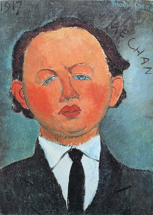 | Signature: | Signed "modigliani" top left in light blue and the text "MECHAN" upper right next to the head and dated "1917" top left | ||||||||||||||||