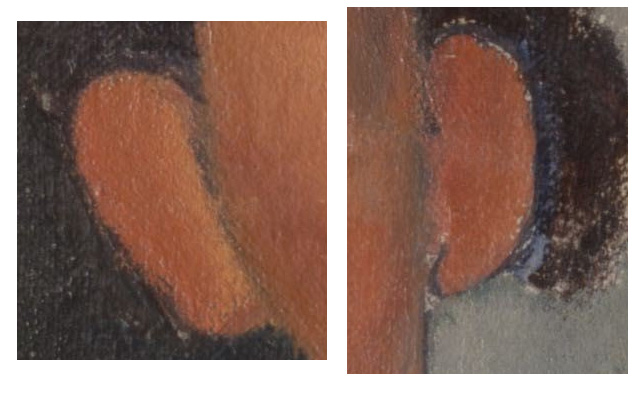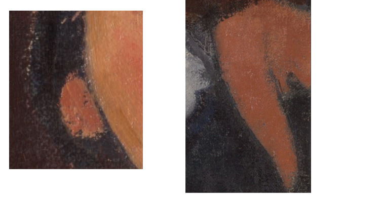 | Other | Nº 205 in D'Atri papers as Portrait de sculpteur Lipchitz et sa femmee - no size or date - provenance in Collection Lipchitz, Paris 1931 ------------------------------------------------------------------------------------------------------------------------------------------------------------------------------------------ Detail of signature in visible normal light: ![]() ------------------------------------------------------------------------------------------------------------------------------------------------------------------------------------------- The eyes of this painting reflect a style Modigliani used from the end of 1915 to the first months of 1918, very similar eye construction can be seen in many Modigliani works from this period: In fact Lipchitz eyes are more cubist style while Berthe's eyes are more in the style of the 1917-18 period. ------------------------------------------------------------------------------------------------------------------------------------------------------------------------------------------ Detail of the ears where the drawing with colors and black detail is visible and is painted over the color (on top of the color) ![]() ------------------------------------------------------------------------------------------------------------------------------------------------------------------------------------------- The painting framed in Chicago, 2017: ------------------------------------------------------------------------------------------------------------------------------------------------------------------------------------------- this painting was made in a reused canvas. ------------------------------------------------------------------------------------------------------------------------------------------------------------------------------------------- |