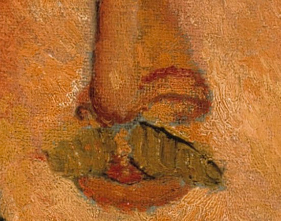 | Other | Not in D'Atri papers ------------------------------------------------------------------------------------------------------------------------------------------------------------------------------------------ Detail of signature in visible normal light: ![]() ------------------------------------------------------------------------------------------------------------------------------------------------------------------------------------------- This painting presents holes in the 4 corners ------------------------------------------------------------------------------------------------------------------------------------------------------------------------------------------ Detail of the nose/ mustache where the drawing with colors and black detail is visible and is painted over the color (on top of the color) ------------------------------------------------------------------------------------------------------------------------------------------------------------------------------------------- Detail of the ear where the drawing with colors and black detail is visible and is painted over the color (on top of the color) ![]() ------------------------------------------------------------------------------------------------------------------------------------------------------------------------------------------- The painting framed in 2017: |