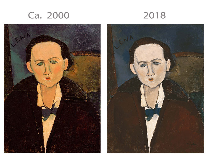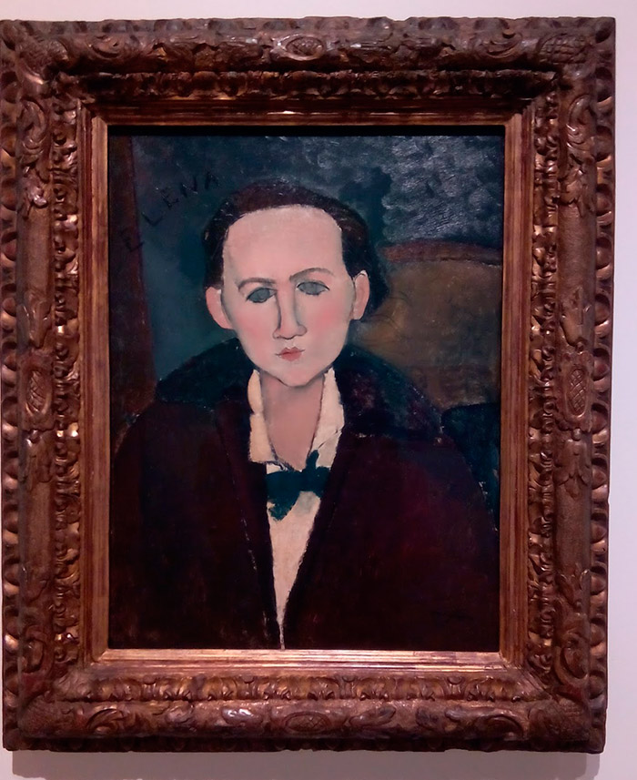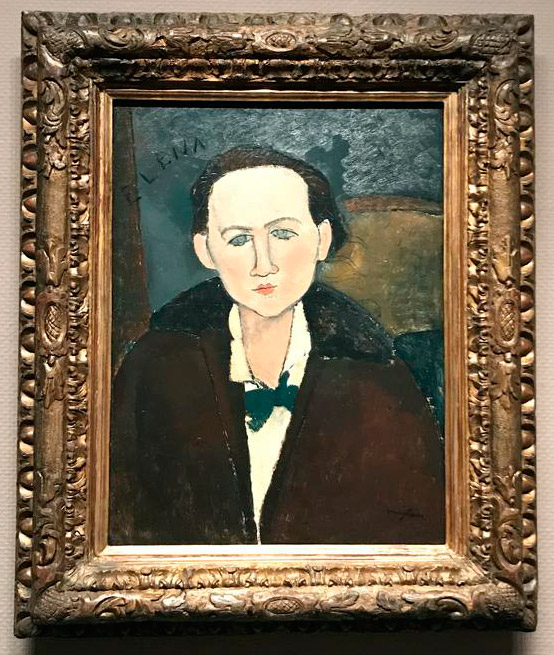 | Other | in D' Atri papers as nº 303 - Col. Povolozky, Paris, 1929. ------------------------------------------------------------------------------------------------------------------------------------------------------------------------------------------ This painting present holes in the corners, all of them covered by restoration ------------------------------------------------------------------------------------------------------------------------------------------------------------------------------------------ Image of the painting framed at the Modigliani and the artists of Montparnasse pre cleaning in 2002: Image of the painting framed at the Phillips Collection after cleaning: ![]() ------------------------------------------------------------------------------------------------------------------------------------------------------------------------------------------ Actual images of the painting reflect a very strong cleaning: ![]() -------------------------------------------------------------------------------------------------------------------------------------------------------------------------------------- There is another portrait of the same sitter at private collection: ![]() ------------------------------------------------------------------------------------------------------------------------------------------------------------------- Detail of the ears where the drawing is clearly visible and is painted over the color (on top of the color) ![]() | ||||||||||||||||