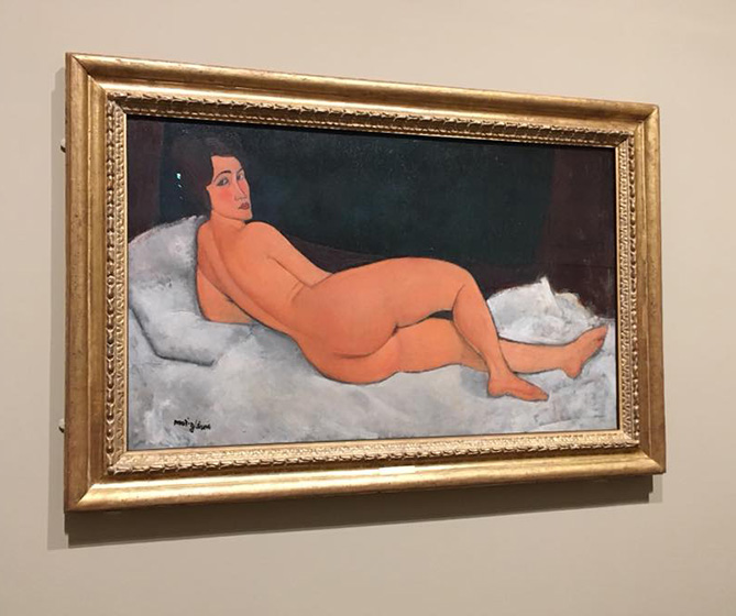 | Exhibitions | -?- Paris, Modigliani , Berthe Weill Gallery, 1917 Paris, Modigliani retrospective, Marcel Bernheim (Galerie Bernheim-Jeune), 1931 (illustrated in cover) nº 15 (titled Grand Nu Couché dated in 1918) Darmstadt, Hessisches Landesmuseum Darmstadt, 1931, Brussels, Modigliani: Retrospective Exhibition. Palais des beaux-arts, 1933 - nº 15 (dated in 1916) Basel, Amedeo Modigliani, Kunsthalle, 1934 - nº 7 Paris, Cinquante ans de peinture française dans les collections particulières de Cézanne et Matisse, Musée des Arts Décoratifs, 1952 - nº 114 Paris, Le Nu à travers les Ages, Galerie Bernheim-Jeune, 1954 - nº 40 (titled Grand nu couché) Paris, Cent Tableaux de Modigliani, Galerie Charpentier, 1958 - nº 63 - dated 1918 Marseille, Modigliani, Musée Cantini, 1958 - nº 21 (dated in 1918) Liege, Modigliani exhibition. Musée Saint Georges, 1980 ? Paris, Modigliani, Musée de Art Moderne de la Ville de Paris, 1981 - nº 53 Lausanne, Modigliani, Utrillo, Soutine, Les peintres de Zborowski et leurs amis, Fondation de L'Hérmitage, 1994 - nº 19 London, Modigliani, Tate Modern, 2017-2018 In process |