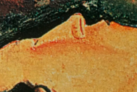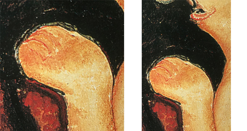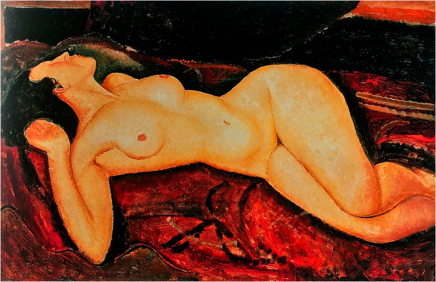 | Other | Nº 253 in D' Atri papers dated 1919 - titled Nu Couche - 65 x 100 - Coquiot Collection ------------------------------------------------------------------------------------------------------------------------------------------------------------------------------------------- Detail of signature in visible normal light: ![]() Signature position (not visible in general image): ------------------------------------------------------------------------------------------------------------------------------------------------------------------------------------------- The eye / nose of this painting is absolutely exceptional in Modigliani, somehow reflect a style Modigliani used from the end of 1915 to the first months of 1918 but they are unique in Modigliani works (Modigliani was doing experiments and this just means evolution): ------------------------------------------------------------------------------------------------------------------------------------------------------------------- Detail of the ear where the contour is clearly visible & detailed, all the small details and shadow/volumes are painted over the color (on top of the color) ![]() ![]() | ||||||||||||||||