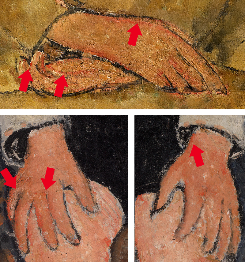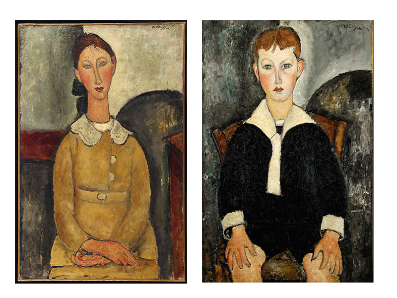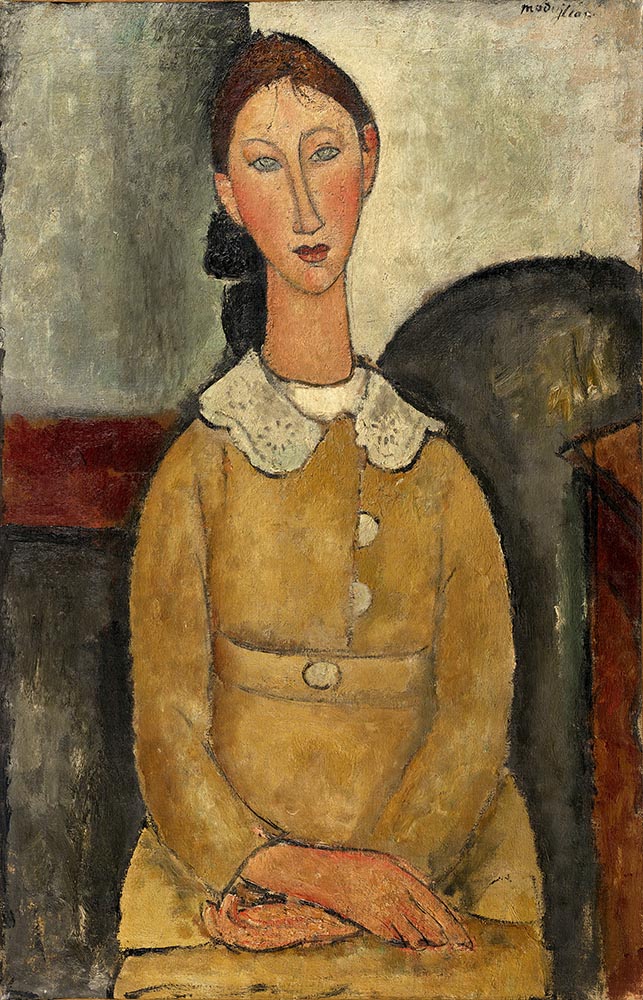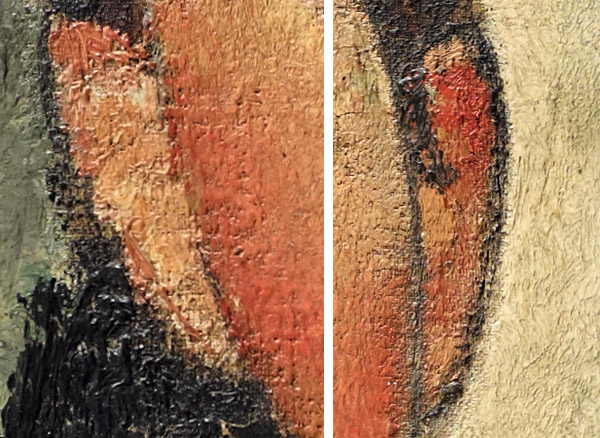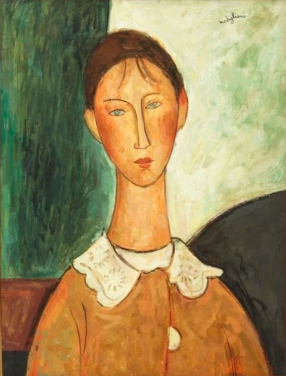 | Other | Nº 36 in D'Atri papers as young girl with white collar /young schoolgirl with white collar - dated 1917 - provenance in Zborowski 1928 > Guillaume > Netter in 1933 ------------------------------------------------------------------------------------------------------------------------------------------------------------------- This work presents holes in the 4 corners, one of them covered by restoration. ------------------------------------------------------------------------------------------------------------------------------------------------------------------- Detail of signature: ![]() ------------------------------------------------------------------------------------------------------------------------------------------------------------------- The painting was made on a canvas with a very basic or null preparation, in some areas you can see the raw linen directly while in others you can see a layer of very thin white primer: ![]() Black borders can be seen all over the canvas stretcher, because the canvas was painted while not nailed to the stretcher, probably against a wood or a wall: ![]() ------------------------------------------------------------------------------------------------------------------------------------------------------------------- The background used is almost the same as the painting of a boy with sailor suit at the Barnes collection: ![]() As can bee seen at simple view the background is the same but there is no furniture in front of the curved shape (probably a stove) and the horizontal line in the back is not present in the boy. The Boy at the Barnes also dated in 1917 is probably a work done in the first months of 1917 or the last of 1916 while the yellow dress girl is made probably in the last months of 1917 or the firsts of 1918, this shows the evolution of Modigliani in terms of background, so this simple contrast between 2 works at the same location same or very similar year and almost identical portrayed reflect a clear demonstration that there is no rules for the backgrounds in Modigliani, he was in constant evolution. Same feature can be seen when looking at the hands of both childs, the evolution of the painting show the artist is leaving behind his spots period (Macchiaioli style) for a more softer representation of colors/deep but many of his classical features remain, like the orange lines of color to represent the volume: ------------------------------------------------------------------------------------------------------------------------------------------------------------------- The painting framed while at St. Petersburg, Modigliani, Soutine and other legends of Montparnasse (the Netter Collection), Curated by Marc Restellini with the Classical dramatic and excesive illumination he usually likes at the Fabergé Museum, 2017-18: ![]() ------------------------------------------------------------------------------------------------------------------------------------------------------------------- Detail of the ears where the contour is clearly visible and is painted over the color (on top of the color) ![]() ------------------------------------------------------------------------------------------------------------------------------------------------------------------------------------------- This is a forgery based on this painting done by Elmyr de Hory (easy to see the total lack of quality compared to the original painting) ![]() | ||||||||||||||||