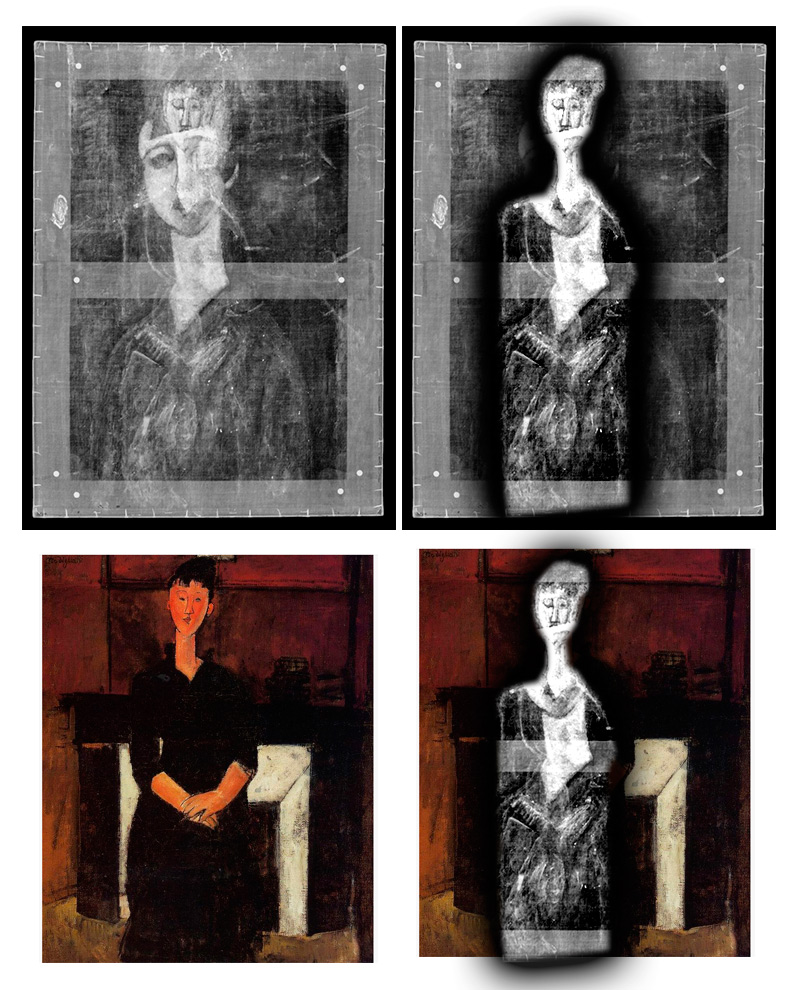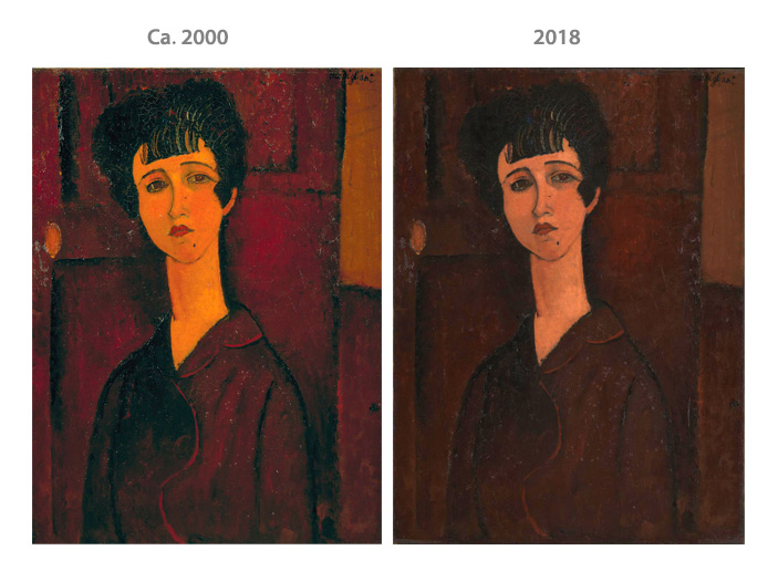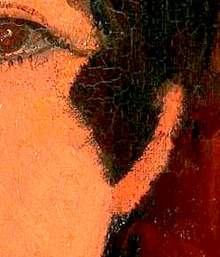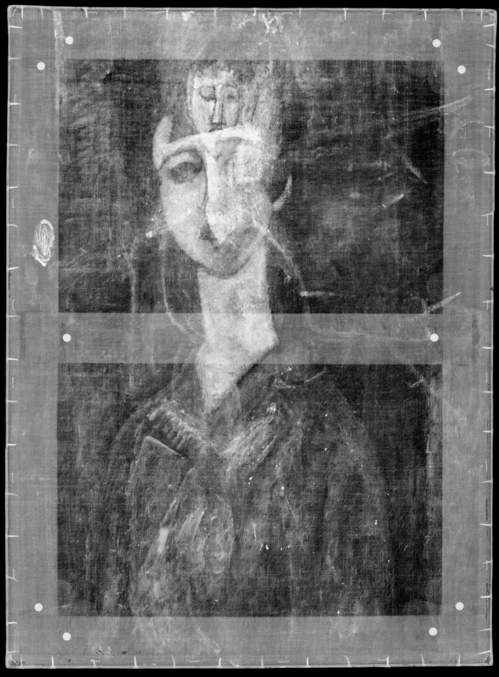 | Other | Nº 144 in D' Atri papers (81 x 59.5 dated in 1916 - provenance in Netter >Reid & Lefevre > Stoop, London 1928) ----------------------------------------------------------------------------------------------------------------------------------------------------------------------------------------- This painting presents holes in the 4 corners, but since it is painted in a reused canvas, probably the holes are from the previous painting and Victoria was painted already in the stretcher. ------------------------------------------------------------------------------------------------------------------------------------------------------------------------------------------ The signature of the painting: ![]() ------------------------------------------------------------------------------------------------------------------------------------------------------------------- Detail of the ears where the contour is clearly visible and is painted over the color (on top of the color) ![]() ------------------------------------------------------------------------------------------------------------------------------------------------------------------------------------------- The painting has been in my opinion excessively cleaned a yellow varnish layer (or layers?) have been retired and with that part of the orange magic used by Modigliani is lost. ------------------------------------------------------------------------------------------------------------------------------------------------------------------- For the Tate Gallery exhibition studies were made and the X ray showed another Modigliani painting under Victoria: ![]() The portrait under Victoria is another version of Beatrice Hastings in front of the fireplace (dated in 1915), the position, size and perspective fits perfect: So we have a 1915 Modigliani under a 1916 or 1917 modigliani, a very common re use of a canvas, but having in mind that some experts say that Modigliani from 1916 is supported by the merchants like Paul Guillaume and Leopold Zborowski and supplied in canvases by these merchants and therefore no longer needs to use poor media such as cardboard or reuse canvases, then we have to rethink all over many commonly accepted opinions. ------------------------------------------------------------------------------------------------------------------------------------------------------------------- The painting framed while at London, Modigliani, Tate, 2017: ![]() | ||||||||||||||||