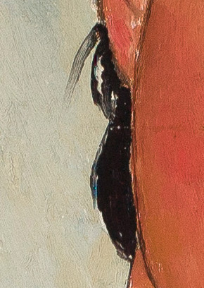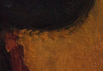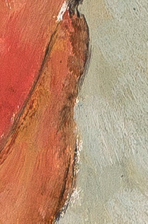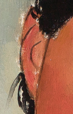 | Other | Nº48 in D' Atri papers, as Elvire, enfant du peuple (Elvire accoude a une table) - 92.5 x 60 - dated 1918 - Provenance in Zborowski > Simon 1929 > Guillaume 1933 ------------------------------------------------------------------------------------------------------------------------------------------------------------------------------------------- Detail of signature in visible normal light: ------------------------------------------------------------------------------------------------------------------------------------------------------------------------------------------- the eyes correspond to the style of 1918-1919 and you can observe how the color in a gradient format eats the black line, maintains some of its cubist traces but the gradient is in color not with shadow, in this painting it is especially striking as Modigliani paints the eyebrows in the form of small discontinuous brush strokes, achieving a curious effect. The nose already presents some of its final characteristics, but the reddish / orange color of the face is not yet the pale pink of some of his final works, the line remains. Modigliani, as in many other works, combines the gradient with the solid spots of color, as you can see in the fin of the nose where there is a solid block while the body of the nose is painted with color gradient. The central point of brightness at the tip of the nose brings vivacity and breaks the schematic simplicity. ![]() ------------------------------------------------------------------------------------------------------------------------------------------------------------------------------------------- Detail of the ear where the drawing is clearly visible and is painted over the color (on top of the color) ![]() ------------------------------------------------------------------------------------------------------------------------------------------------------------------------------------------- Detail of the loose hair that Modigliani liked so much: ![]() Detail of the brush-stroke close to the figure, which is done in the form of short, straight brush strokes, while in many others we can see brush strokes in zig zag in the same area, in this case Modigliani makes use of another brush stroke, the medium is adapts to its purpose, not vice versa. ![]() Detail of the large round brush strokes that form something similar to small fans but in fact they are the end of a long stroke, this feature is seen in a few of his paintings, but is totally Modigliani in the way of painting linear contrast surfaces, this same brush end is visible in his famous side stripes. Detail of the small Macchioli brush strokes that Modigliani likes so much, in this case he applies them on the hand to shape the shadow outline of the finger and give vivacity. More l Macchioli breaststroke the elbow, this small spots are very common in the borders. ![]() ------------------------------------------------------------------------------------------------------------------------------------------------------------------------------------------ The painting framed at London, Modigliani, Tate Gallery, 2017 ![]() | ||||||||||||||||