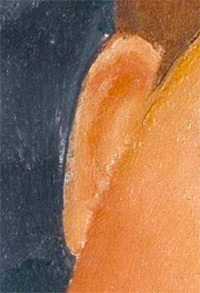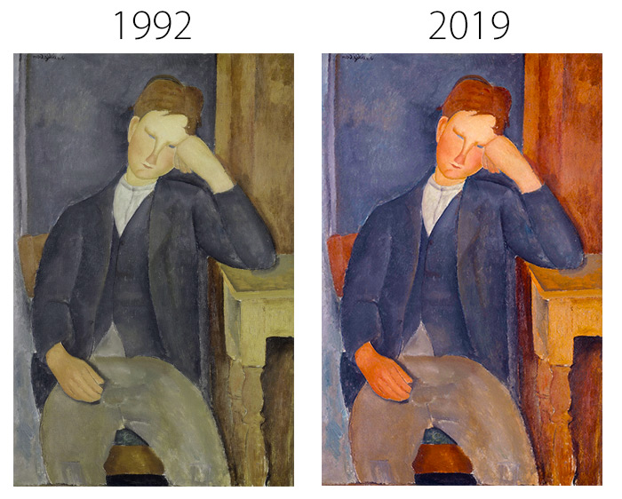 | Other | Nº 203 in D'Atri papers as The Young apprentice ( young man leaning) - dated 1918, painted in Paris - size 100 x 65 - Provenance Zborowski > Guillaume 1929 ------------------------------------------------------------------------------------------------------------------------------------------------------------------------------------------- This painting presents holes in the 4 corners all covered ------------------------------------------------------------------------------------------------------------------------------------------------------------------------------------------- The painting went on study during the 1981 study by the RNMF with undoubted Modigliani hand ------------------------------------------------------------------------------------------------------------------------------------------------------------------------------------------- Signature of the painting: ------------------------------------------------------------------------------------------------------------------------------------------------------------------------------------------- Detail of the ear where the drawing is clearly visible and is painted in color ![]() ------------------------------------------------------------------------------------------------------------------------------------------------------------------------------------------- The painting has been recently cleaned and the restoration is in my opinion magnificent since it respected all the reds/oranges of the skintones and at the same time recovered the blues and redish browns so similar to Cezanne present all over the Modigliani production. ![]() ------------------------------------------------------------------------------------------------------------------------------------------------------------------------------------------- The painting framed at the Orangerie in Paris: ------------------------------------------------------------------------------------------------------------------------------------------------------------------------------------------- The same sitter can be seen in another painting with different position: - ![]() |