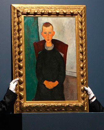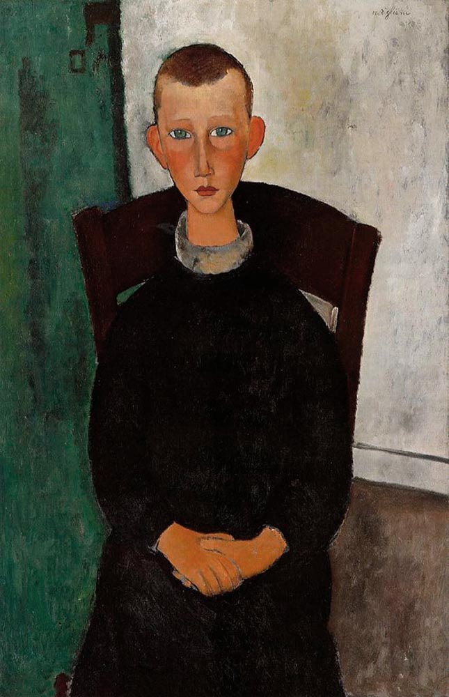 | Other | Painted in Cagnes, 1918 ? ------------------------------------------------------------------------------------------------------------------------------------------------------------------------------------------- Nº 329 in D'Atri papers - titled le gosse du concierge - dated Cagnes 1918 - 100 x 65 - Provenance: Zborowski > Libaude > Bing > Ditilleul 1929 > Masurel ------------------------------------------------------------------------------------------------------------------------------------------------------------------------------------------- This painting presents holes in the 4 corners ------------------------------------------------------------------------------------------------------------------------------------------------------------------------------------------- Signature of the painting: ------------------------------------------------------------------------------------------------------------------------------------------------------------------------------------------- Detail of the ears where the drawing is clearly visible and is painted in color ![]() ------------------------------------------------------------------------------------------------------------------------------------------------------------------------------------------- I have no information of any cleaning procedures on this work, but the auction in 2006 showed a clean painting with a clear (non oxidated) varnish so it must have been cleaned to auction, the last image of the painting dates from 2017 and show the painting much more dull and flat, probably it can be a trick of light or the other possible reason is that it has been over washed loosing many of the main red tones, but I do not have information. ------------------------------------------------------------------------------------------------------------------------------------------------------------------------------------------- The painting framed for auction in 2006: ![]() |