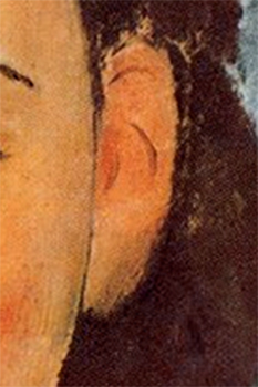 | Other | Nº 120 t in D' Atri papers (with doubts) Jeune Fille assise - 48.5 x 32 cm - 1918 - Gallery Paquerau, Paris (1934) ------------------------------------------------------------------------------------------------------------------------------------------------------------------------------------------- The painting orinally presented holes in the 4 corners but it was cut in circular shape in the corners in unknown date ------------------------------------------------------------------------------------------------------------------------------------------------------------------------------------------- Detail of signature in visible normal light: Only the black: ------------------------------------------------------------------------------------------------------------------------------------------------------------------------------------------- Eyes show slight traces of the style of 1917 but the coloring and the incarnation is definitely from the period of 1918-1919 the eyelashes are a novel element in their application format (there are many other eyelashes in Modigliani's oeuvre, but this style is new). ![]() ------------------------------------------------------------------------------------------------------------------------------------------------------------------------------------------- Detail of the ears where the drawing is clearly visible and is painted over the color (on top of the color) ![]() | ||||||||||||||||
