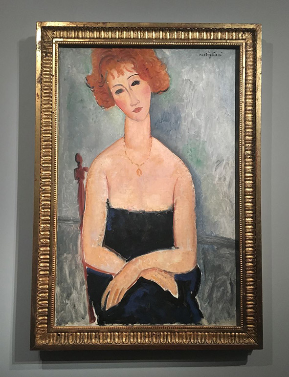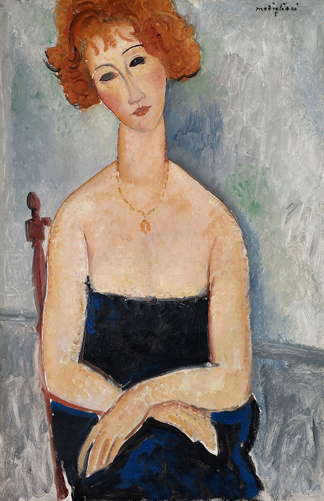 | Exhibitions | -?- Paris, Modigliani, Galerie Bernheim-Jeune, 1922 - nº 16 - titled La Dame Rousse Bern, Modigliani Campigli Sironi, Kunsthalle Bern, 1955 - nº 15 - Madrid, Modigliani y su tiempo, Museo Nacional Thyssen Bornemisza, 2008 Paris, De Zubaràn à Rothko, Collection Alicia Koplowitz, Musée Jacquemart André, 2017 In process |