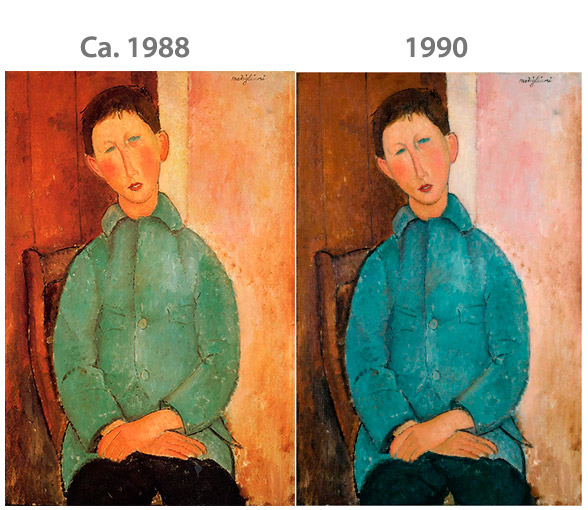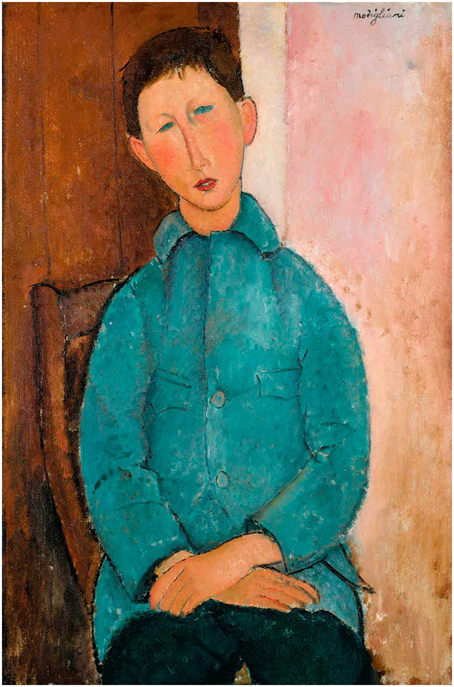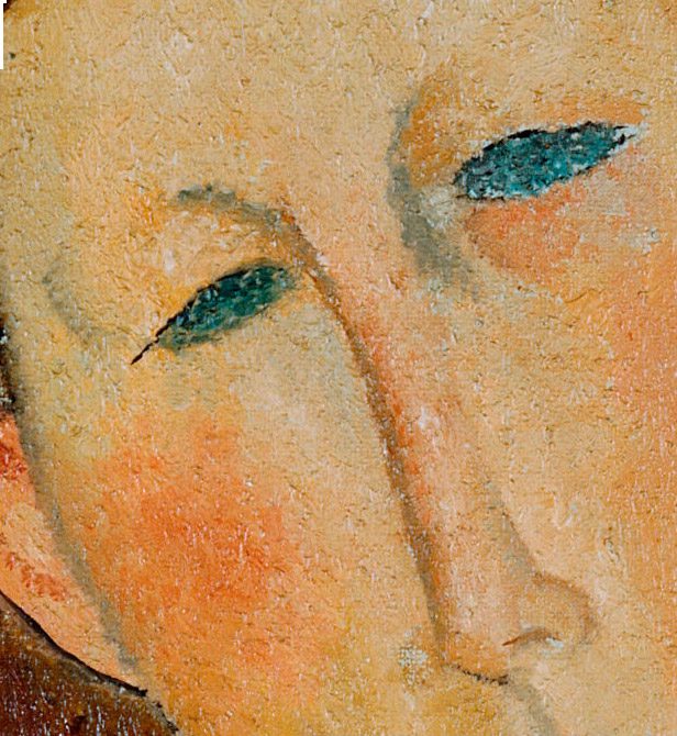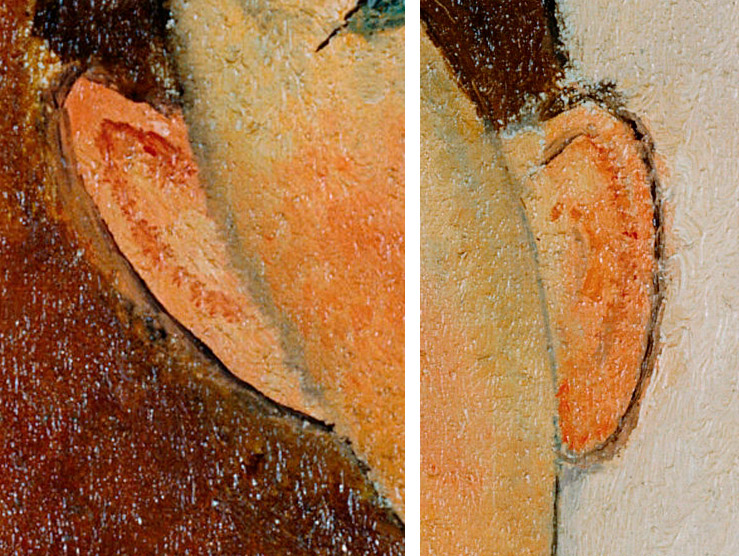 | Other | Not in D' Atri papers ------------------------------------------------------------------------------------------------------------------------------------------------------------------------------------------- Detail of signature in visible normal light: ![]() ------------------------------------------------------------------------------------------------------------------------------------------------------------------------------------------- The eyes and nose of this painting reflect a style Modigliani used from the end of 1917 to the first months of 1919, very similar eye and nose construction can be seen in many Modigliani works from this period, the line lies under the color and the color degradation is made using color not shadow. ![]() ----------------------------------------------------------------------------------------------------------------------------------------------------------------------------------------- This painting presents holes in 4 corners ------------------------------------------------------------------------------------------------------------------------------------------------------------------------------------------ I have no information of any cleaning procedure in this case, but the surface seems to be clean and the contrast between before & after 2004 auction make clear that the painting was cleaned for auction. ------------------------------------------------------------------------------------------------------------------------------------------------------------------------------------------- Detail of the ears where the drawing is clearly visible and is painted over the color (on top of the color) ![]() ------------------------------------------------------------------------------------------------------------------------------------------------------------------------------------------- Detail of the brushwork of the hair: ![]() ------------------------------------------------------------------------------------------------------------------------------------------------------------------------------------------- There is a very similar painting with the boy in another position but with the same customs, the experts date it in 1919 based on the Cagnes text near the signature: ![]() | ||||||||||||||||