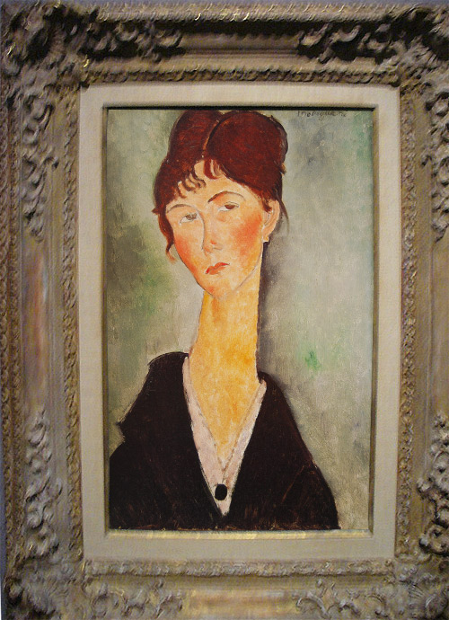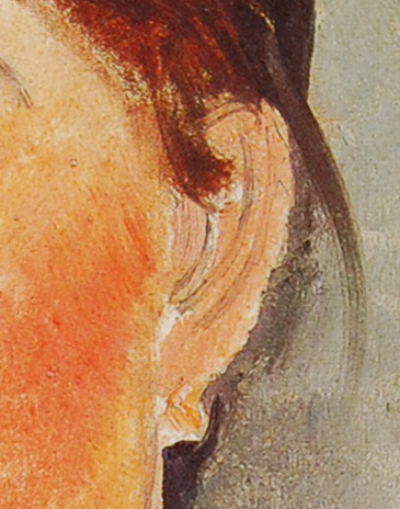 | Other | Nº 79 in D' Atri papers - as tete de Femme - dated 1917-1918 - Duveen London 1933 ------------------------------------------------------------------------------------------------------------------------------------------------------------------------------------------- Detail of signature in visible normal light: ------------------------------------------------------------------------------------------------------------------------------------------------------------------------------------------- This painting presents holes in the 3 corners ------------------------------------------------------------------------------------------------------------------------------------------------------------------------------------------- Detail of the ear where the drawing is clearly visible and is painted over the color (on top of the color) ![]() ------------------------------------------------------------------------------------------------------------------------------------------------------------------------------------------- The painting framed at London, Modigliani and his models, Royal Academy of Arts, 2006: ![]() ------------------------------------------------------------------------------------------------------------------------------------------------------------------------------------------- Similitudes with the coffe singer dated in 1917 at the National Gallery of Art in Washington are clear: -![]() | ||||||||||||||||