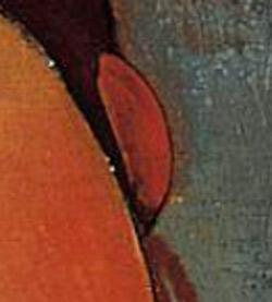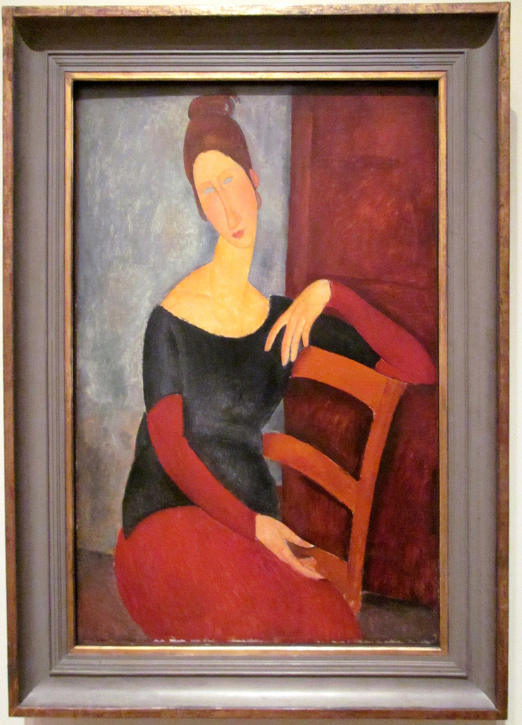 | Other | Nº 221 in D' Atri papers - titled Portrait of jeanne Hébuterne - size 100 x 65 - dated Nice 1918 - provenance in Bernheim 1928 and repeated as nº 179 - La robe Rouge - 100 x 65 - 1916 - Col. Lucien Demotte, New York 1931 ------------------------------------------------------------------------------------------------------------------------------------------------------------------------------------------- This painting presents holes in the 4 corners ------------------------------------------------------------------------------------------------------------------------------------------------------------------------------------------- Detail of signature in visible normal light: ------------------------------------------------------------------------------------------------------------------------------------------------------------------------------------------- Detail of the ear where the drawing is clearly visible and is painted over the color (on top of the color) ![]() ------------------------------------------------------------------------------------------------------------------------------------------------------------------------------------------- The painting framed at Norton Simon Museum, Pasadena in 2017: ![]() ------------------------------------------------------------------------------------------------------------------------------------------------------------------------------------------- The painting at Modigliani, Galerie Bing et Cie, 1925: |