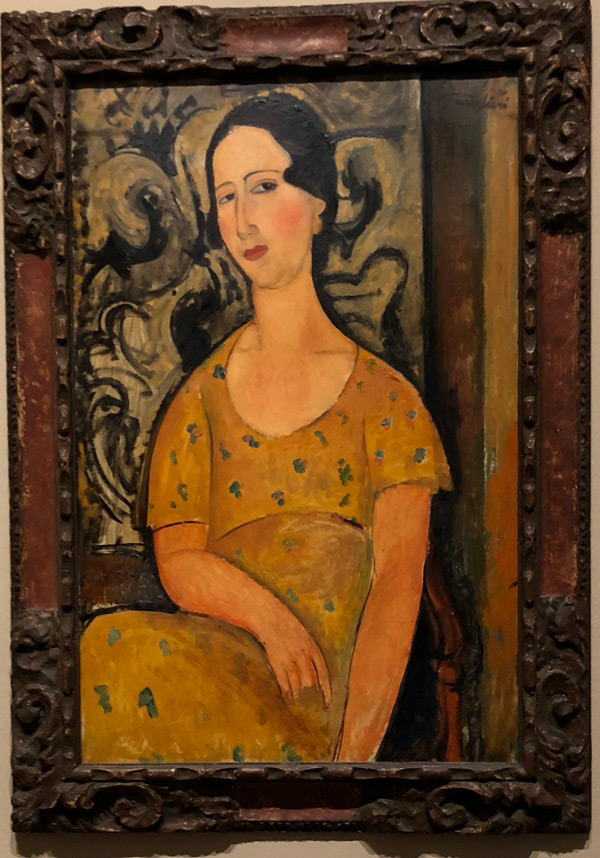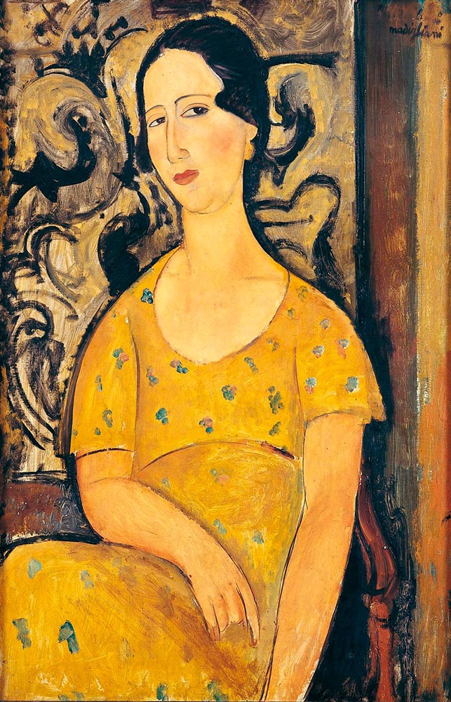 | Other | Nº 32 in in D' Atri papers as Jeune fille à la robe jaune - size 92 x 65 - dated 1917-1918 - Paris - Provenance in Bernheim Jeune > Netter in 1929 ------------------------------------------------------------------------------------------------------------------------------------------------------------------------------------------- This painting is also known as Madame Modot because the portrayed is the wife of Gaston Modot who was also portrayed twice by Modigliani: - ------------------------------------------------------------------------------------------------------------------------------------------------------------------------------------------- This painting presents holes in the 4 corners ------------------------------------------------------------------------------------------------------------------------------------------------------------------------------------------- Detail of signature in visible normal light: ------------------------------------------------------------------------------------------------------------------------------------------------------------------------------------------- The painting at the Cerruti residence in 2019: The painting framed at London, Modigliani, Tate Gallery, 2017: The painting in Venezia, Mostra retrospettiva di Modigliani – Curated by Lionello Venturi - Biennale di Venezia , Sala XII degli Appels d'Italie, 1930 ![]() |