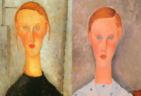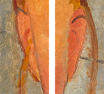 | Other | nº 305 in D'Atri papers as La Jolie ecolière, dated 1917 - Provenance Guillaume in 1929 > Zborowski, Paris ----------------------------------------------------------------------------------------------------------------------------------------------------------------------- Probably : Pfannstiel, Modigliani et son oeuvre, etude critique et catalogue raisonne, bibliotheque des arts, Paris, 1956, - nº 191 - title La Jolie Ecolière - dated 1917 size 60.5 x 45.5 signed top right. Pfannstiel, "catalogue presume" Modigliani. L'Art et la Vie. Preface de Louis Latourrettes, Seheur, Paris, 1929, p. 31-32 ----------------------------------------------------------------------------------------------------------------------------------------------------------------------- Signature of the painting: ----------------------------------------------------------------------------------------------------------------------------------------------------------------------- Detail of the pointy ears where the drawing is clearly visible and is painted over the color (on top of the color) ![]() ------------------------------------------------------------------------------------------------------------------------------------------------------------------------------------------- The painting framed at the McNay: ------------------------------------------------------------------------------------------------------------------------------------------------------------------------------------------- Probably the same girl as in this other painting dated 1918: - woman or the merry school girl, dated 1918 by experts - girl in a polka dot blouse dated 1919 by expertsBoth heads to compare: ![]() |