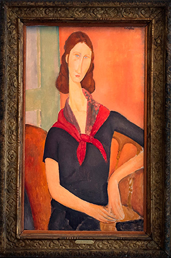 | Exhibitions | -?- ? Paris, Modigliani retrospective, Marcel Bernheim (Galerie Bernheim-Jeune), 1931 - nº 27 titled Femme au foulard rouge (Mme. Hébuterne) Paris, Modigliani Peintures, Galerie de France, 1945-46 - nº 31 Paris, Cent Tableaux de Modigliani, Galerie Charpentier, 1958 - nº 95 ??? Marseille, Modigliani, Musée Cantini, 1958 - nº 36 Geneva, De l'Impressionnisme à l'Ecole de Paris, Musée de l’Athénée, 1960 - nº 53 Lausanne, Chefs-d'œuvre des collections suisses de Manet à Picasso, Palais de Beaulieu, 1964 - nº 294 Paris, Chefs-d'œuvre des collections suisses de Manet à Picasso, Orangerie , 1967 - nº 201 Tokyo, Modigliani, Grand Magazin Seibu, 1968 - nº 60 Kyoto,Modigliani, National Museum of Art , 1968 - nº 60 Fukuoka , Modigliani, Fukuoka Cultural Center , 1968 - nº 60 Geneva, Du Futurisme au Spatialisme, Musée Rath, 1977-1978 - nº 58 Paris, Modigliani, Musée de Art Moderne de la Ville de Paris, 1981 - nº 84 Tokyo, Modigliani exhibition, National Museum, 1985 - nº 125 Nagoya, Modigliani exhibition, Aichi Prefectural Art Gallery, 1985 - nº 125 Lausanne, Modigliani, Utrillo, Soutine, Les peintres de Zborowski et leurs amis, Fondation de L'Hérmitage, 1994 - nº 15 In process |