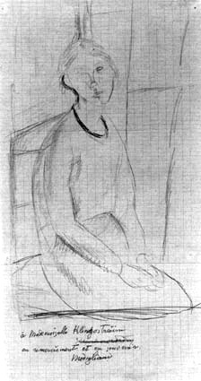 | Other | Not in D'Atri papers ------------------------------------------------------------------------------------------------------------------------------------------------------------------------------------------- Restellini dates in November 1919 ------------------------------------------------------------------------------------------------------------------------------------------------------------------------------------------- Detail of the ears where the drawing is clearly visible and is painted over the color (on top of the color) ![]() ------------------------------------------------------------------------------------------------------------------------------------------------------------------------------------------- There is a Drawing that could be seen as the sketch for this painting at the The Danish Royal Collection of Graphic Art (inv. Nº KKS1959-24) with the text: "à Mademoiselle Klin(ck)gostreüm / en remerciement et en souvenir. / Modigliani" ![]() |
