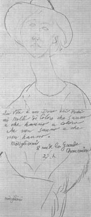 | Other | Not in D'Atri papers ------------------------------------------------------------------------------------------------------------------------------------------------------------------------------------------- Restellini dates in November 1919 (I guess based in the date of the drawings at the Danish Royal Collection of Graphic Art) ------------------------------------------------------------------------------------------------------------------------------------------------------------------------------------------- Signature of the painting: ------------------------------------------------------------------------------------------------------------------------------------------------------------------------------------------- Detail of the ears where the drawing is clearly visible and is painted over the color (on top of the color) even the detail of the earrings can be seen in the black dots under the ear: ![]() ------------------------------------------------------------------------------------------------------------------------------------------------------------------------------------------- There are various Drawings that could be seen as the sketch for this painting at the The Danish Royal Collection of Graphic Art 1.- Inv. Nº KKS1959-14 with the text: : " La Vita è un Dono dei Pochi / ai Molti di Coloro che sanno / e che hanno a Coloro / che non sanno e che / non hanno/ Modigliani / 8 rue de la Grande / Chaumière / 2'. h." ![]() 2.- Inv. Nº KKS1965-190 with the text: "modigliani / 11 Novembre / 1919" ![]() |