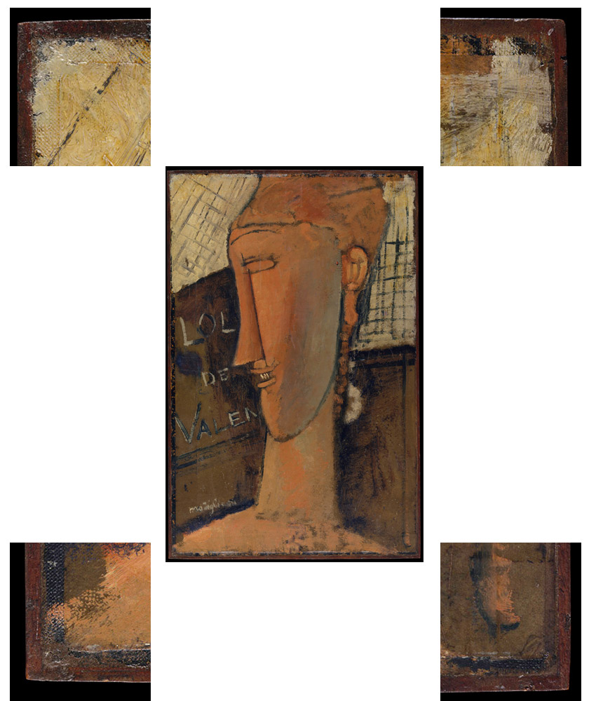 | Corners: | The work present 4 clear holes in the corners made while painting, a classic way of Modigliani to paint was to mark the sides with a black line made with brush, pin to the wall or to a wood and then start to paint. Many works by Modigliani present this method of painting that has been discovered recently (2017). The only publication that has given any interest to this feature is the recent Burlington magazine publications over the Tate gallery retrospective but with no in deep analysis of this feature, just came as an anecdotal point. ![]() |