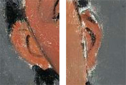 | Other | Not in D' Atri papers? ------------------------------------------------------------------------------------------------------------------------------------------------------------------------------------------- Signature of the painting: ------------------------------------------------------------------------------------------------------------------------------------------------------------------------------------------- Detail of the ears where the drawing is clearly visible and is painted in color ![]() ------------------------------------------------------------------------------------------------------------------------------------------------------------------------------------------- Restellini mentions in " l'Ange du visage grave" p. 232 that this painting has the same "inspiration"as Antonia: -![]() Just a simple look to the brushwork in close up show they could not be more different: 1.- Antonia is a classical sculptural composition made in color shades with small touches that reminds the macchiaioli style brushwork painters of his youth (look at small green little dots outside the face contour) 2.- Fantesca is a plain color filled composition of black line with almost a null relief brushwork. ------------------------------------------------------------------------------------------------------------------------------------------------------------------- The painting framed for auction in Sotheby's in 2009: |