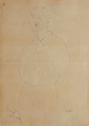 | Other | Nº 268 in D' Atri papers -oil on canvas - size 105 x 74 cm. - 1915 - Guillaume Coll. by 1929 ---------------------------------------------------------------------------------------------------------------------------------------------------------------------------------------- Signature: ------------------------------------------------------------------------------------------------------------------------------------------------------------------------------------------- Detail of the ears where the drawing is clearly visible and is painted in color ![]() Curiosity: Marc Restellini extract from a report by him will give a deeper comprehension of the private expert way of working: ![]() Translation: The ears: When they are left exposed in female portraits (rare), they are not detailed. Even in the portraits of men, they are not the object of so much detail. Exactly the opposite to this case, the ears are full in details, as detailed as the eyes or the hair... ------------------------------------------------------------------------------------------------------------------------------------------------------------------------------------------- The painting framed at the museum in 2016: ![]() ----------------------------------------------------------------------------------------------------------------------------------------------------------------------------------------------------- In Modigliani J. , Modigliani: Man and Myth, Orion Press, New York, 1958, p. 71: Paul Guillaume and Beatrice In 1914 Max Jacob introduced Modigliani to Paul Guillaume. On April 6, 1932, Guillaume wrote to Scheiwiller: "In 1914, through all of 1915 and a part of 1916, I was the only purchaser of Modigliani, and it was only in 1917 that Zborowski became interested in him. Modigliani was introduced to me by Max Jacob. He was then living with Beatrice Hastings, and he worked either in her house, at the painter Haviland, in a studio that had been rented for him at 13 Rue Ravignan, or in a little house in Montmartre where he had lived with Beatrice and where he did my portrait." The portrait of Paul Guillaume — with the words "Novo Pilota" written on the lower left-hand corner — was painted in 1915 at 13 Rue Norvins, the house where Beatrice lived and before her, Emile Zola. Quite interesting to see in Restellini, L'Ange au visage grave, Musée du Luxembourg, Paris, 2002 p. 234 the next text: " It was at 13 rue Norvins, the house of Beatrice Hastings, that Modigliani made the portrait of his first marchand... a complete copy and paste from Jeanne Modigliani in 1958 and presented as investigation? ----------------------------------------------------------------------------------------------------------------------------------------------------------------------------------------------------- Sketch portrait de Paul Guillaume à mi-cuisse, Ca. 1915 at the musée de l'Orangerie ![]() |